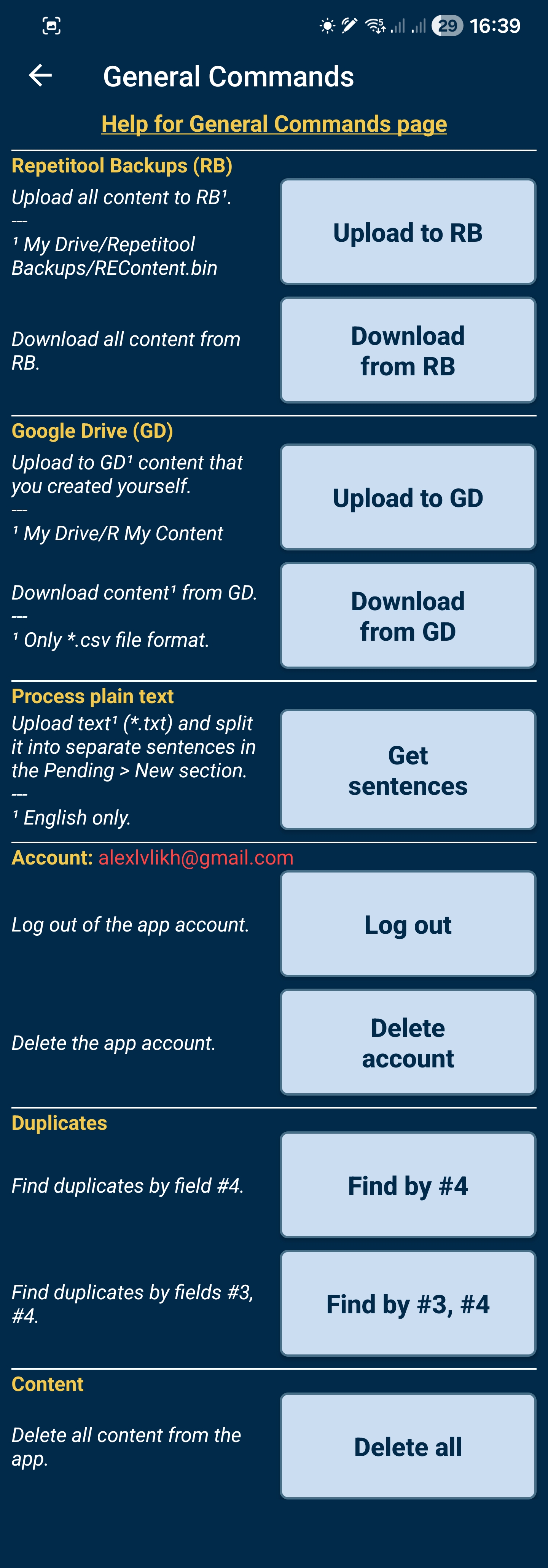 Download from RB - to download to the app all content from the folder "Repetitool Backups" on your Google Drive in your account.